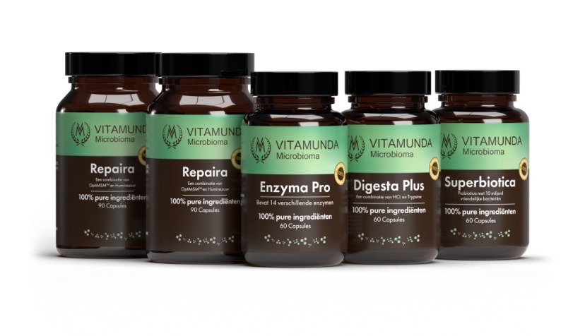 Het Microbioma Programma bestaat uit de producten Repaira, Enzyma Pro, Digesta Plus en Superbiotica. Dit Microbioma Programma kan na de DarmDetox met Chlorella kuur, of los gevolgd worden. Het Microbioma Programma bestaat uit de producten Repaira, Superbiotica, Digesta Plus en Enzyma Pro. De Prebiotica kun je er extra bij bestellen.